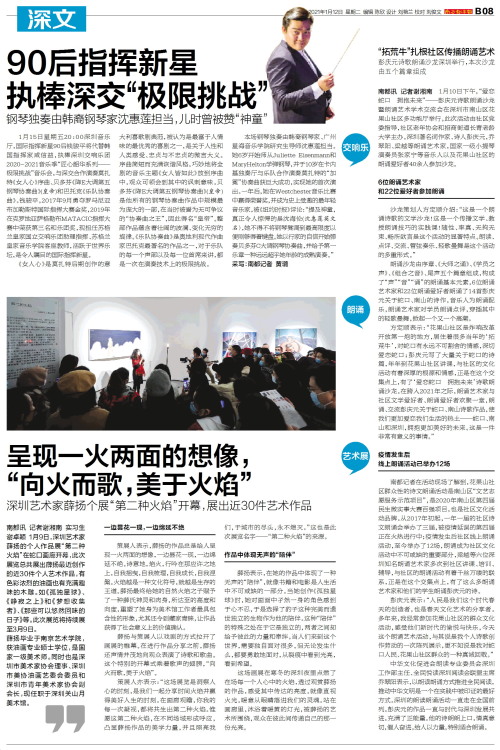 艺术展南都讯 记者谢湘南 实习生谢卓颖 1月9日,深圳艺术家薛扬的个人作品展“第二种火焰”在蛇口画廊开幕,此次展览总共展出薛扬最近创作的近30件个人艺术作品,有色彩浓烈的油画也有充满趣味的木雕。如