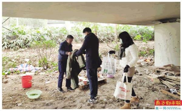 1月8日下午,石岩街道救助人员巡查到洲石路桥底,发现几名流浪人员正在裹着被子,救助人员立即上前为他们送上防寒棉大衣、棉被、八宝粥、雨衣等御寒物资,并劝导他们进站避寒。对不愿接受救助或去救助站的流浪人员进行耐心劝导,对缺少防寒衣物的,立即发放救助物资并将情况上报民政部门及时进行下一步救助。
