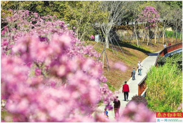 大沙河生态长廊两岸繁花似锦,放眼望去如一片粉紫色的海洋。 南方日报记者 朱洪波 摄