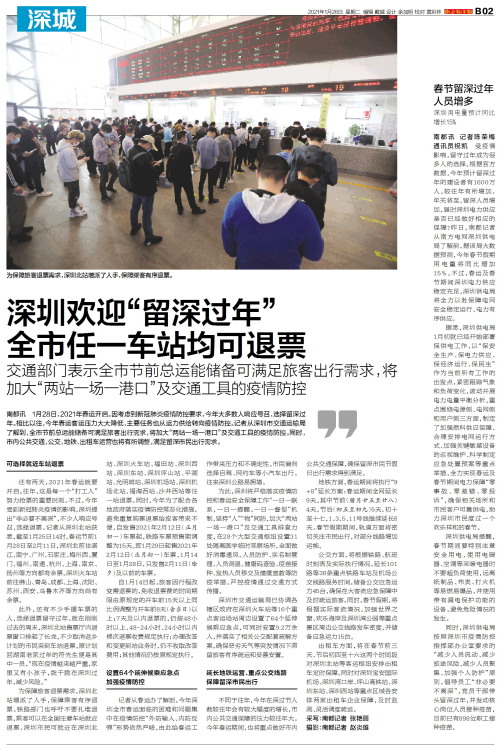 南都讯 1月28日,2021年春运开启。因考虑到新冠肺炎疫情防控要求,今年大多数人响应号召,选择留深过年。相比以往,今年春运客运压力大大降低,主要任务也从运力供给转向疫情防控。记者从深圳市交通运输局了解到,全市节前总运能储备可满足旅客出行需求,将加大“两站一场一港口”及交通工具的疫情防控。同时,市内公共交通,公交、地铁、出租车运营也将有所调整,满足留深市民出行需求。