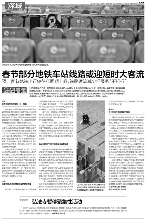 2021年春运已开启一周的时间。相比往年的人头攒动,今年的春运显得尤为“冷清”,客流出现大幅度下降,深圳春运首趟临客上座率只有往年的20%。另外,部分连接机场、高铁站等交通枢纽的地铁车站,如机场站、深