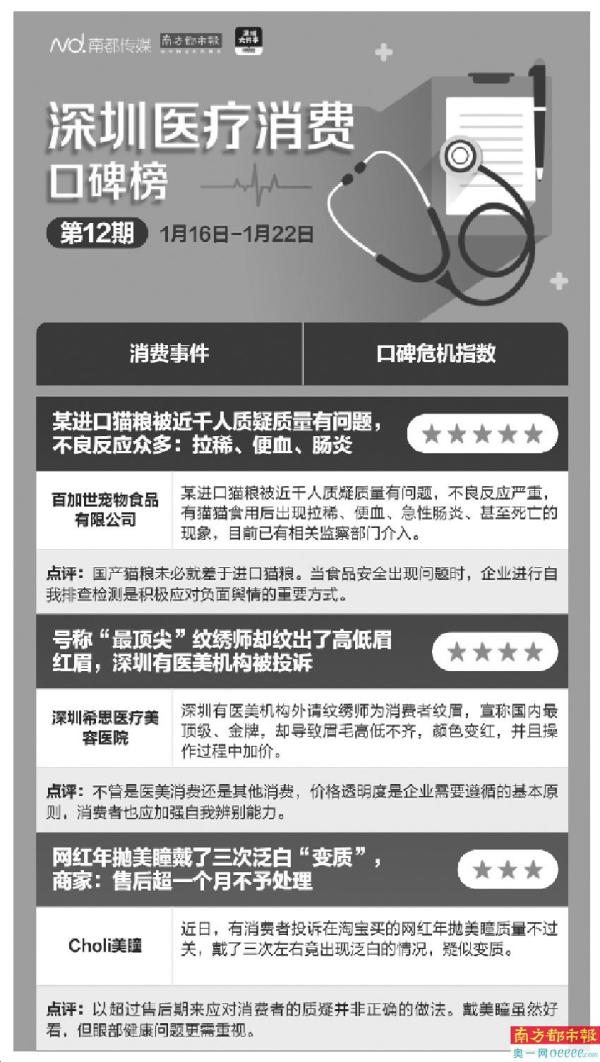 据深消委、黑猫投诉等投诉平台以及媒体舆情数据得出,从1月16日至1月22日的医疗消费投诉有50多条。某进口猫粮被近千人质疑质量有问题,不良反应严重,有猫猫食用后出现症状甚至死亡;深圳有消费者称,有医美机构外请文绣师为其文眉,微信中宣称为国内最顶级、金牌,却导致眉毛高低不齐,颜色变红;某网红年抛美瞳戴了三次就泛白“变质”,被质疑质量不过关。