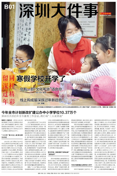 南都讯 记者朱倩 2月3日,2021年深圳教育工作会议以视频会议形式召开。深圳市委教育工委书记、市教育局局长陈秋明表示,今年全市计划新改扩建公办中小学学位10.37万个,新增幼儿园学位2.5万个。“十