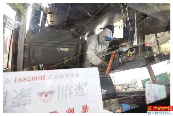 ↓2月4日中午,深圳宝安107国道洪桥头省级春运执勤点,工作人员登车检查春运班车的运行信息。