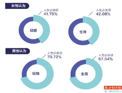 调研显示,认为结婚和生育是人生必选项的女性均远低于男性,分别占比41.75%和42.08%,整体不足一半。而男性对此却非常热衷,认为结婚和生育是人生必选项的占比分别为70.72%和67.54%,整体接近七成。