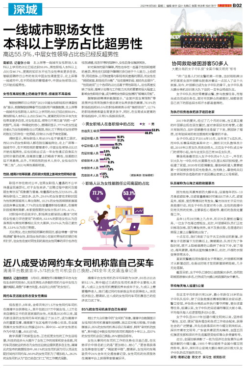 南都讯 记者张小玲 北上深等一线城市女性职场人本科以上学历的占比已经达到55.9%,男性职场人本科以上占比仅46.7%。更高的知识水平也为女性带来更多自信,智联招聘昨日公布的有关中国女性调查显示,北上