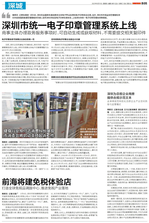 南都讯 记者张艳丽 3月9日,深圳在全国率先落地商事主体电子营业执照和电子印章综合应用。当天,深圳市市场监督管理局和深圳市政务服务数据管理局相关负责人发布深圳市制定电子印章标准体系、上线深圳市统一电子