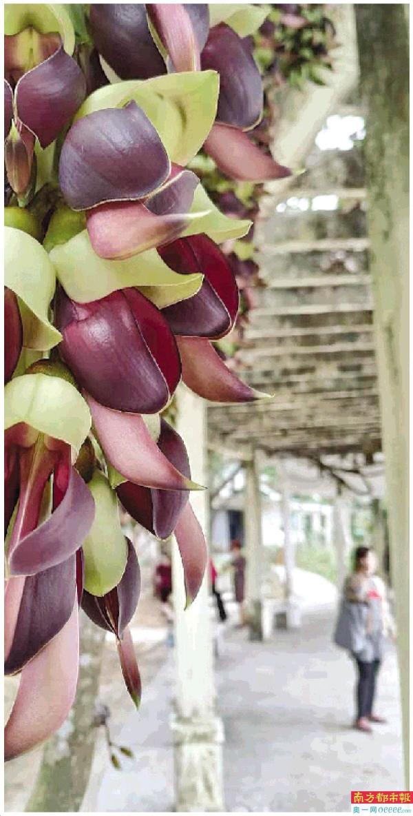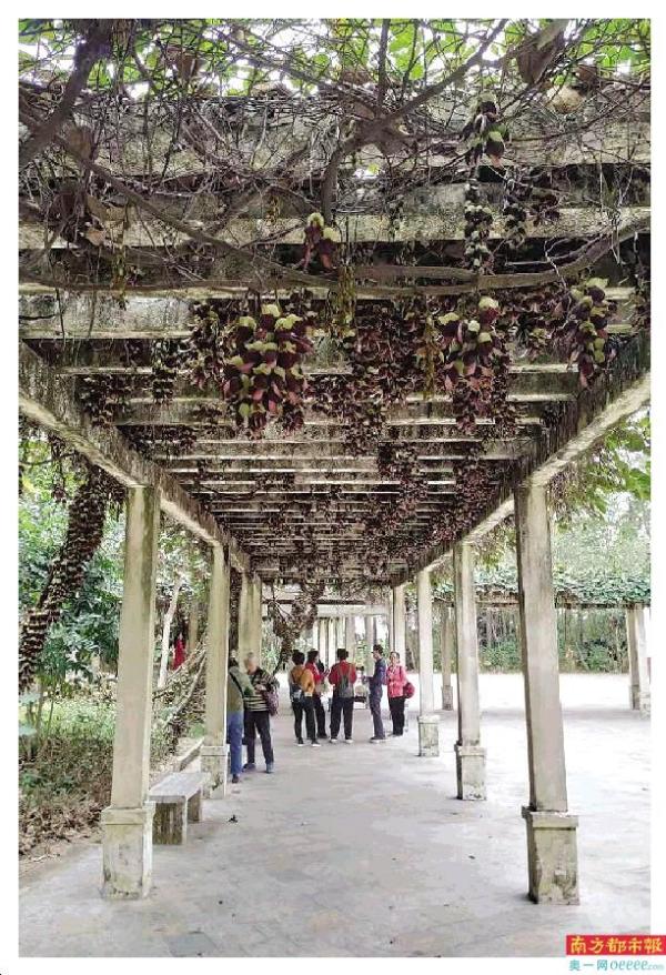 从位于罗湖区延芳路的东湖公园东门入口步行约100米,便能看到一条错落在小广场的连廊。放眼连廊的廊架顶部、周边藤蔓,即可看到一簇簇垂落的紫红色禾雀花,远观似一串串成熟压枝的葡萄,又如一幕幕编织而成的花帘,颇为壮观。