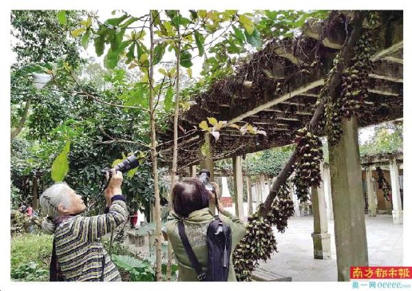“禾雀花对空气质量的要求比较高,一般生长在山林地,比较少在市区。”沈晓岚补充道,东湖公园地处梧桐山边上,空气质量较好,有着比较适合禾雀花生长的小气候。资料显示,东湖公园最早于2008年在公园西南门的东部山林广场周围绿地栽种禾雀花,由于其长势较强,几年内便形成花海景观。对此,公园方面分别在2011年和2015年修建了部分花架。在花架的支撑下,禾雀花长势更强,花序从廊架间隙垂下,观赏性更好。