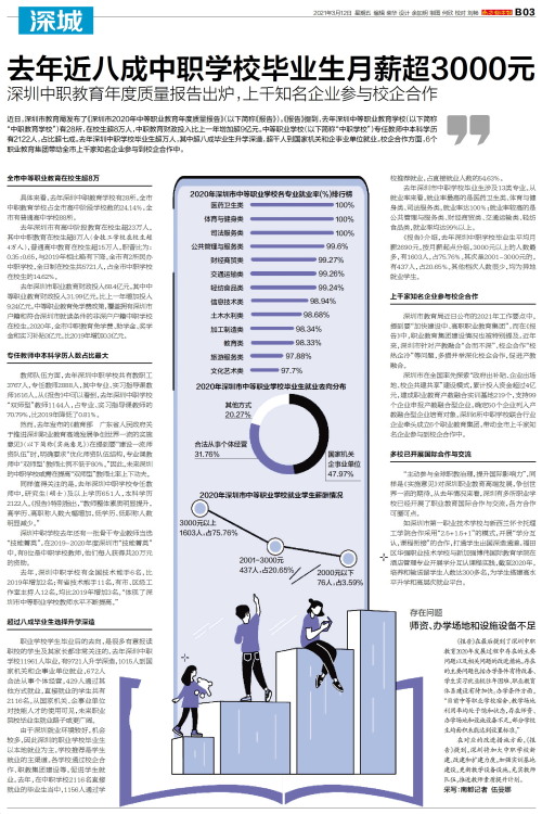 近日,深圳市教育局发布了《深圳市2020年中等职业教育年度质量报告》(以下简称《报告》)。《报告》提到,去年深圳中等职业教育学校(以下简称“中职教育学校”)有28所,在校生超8万人,中职教育财政投入比上一年增加超9亿元。中等职业学校(以下简称“中职学校”)专任教师中本科学历有2122人,占比超七成。去年深圳中职学校毕业生超万人,其中超八成毕业生升学深造,超千人到国家机关和企事业单位就业。校企合作方面,6个职业教育集团带动全市上千家知名企业参与到校企合作中。