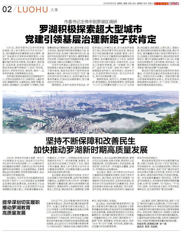 3月5日,深圳市委书记王伟中到罗湖区调研,深入学习贯彻习近平总书记对广东、深圳重要讲话和重要指示批示精神,落实广东省委书记李希来深调研要求,以走在前列、勇当尖兵的政治自觉高标准高质量开展好党史学习教育