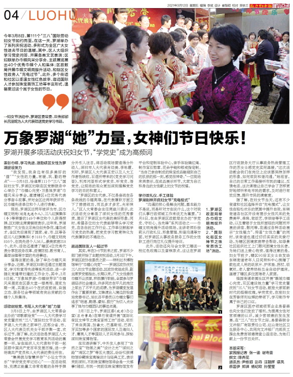 今年3月8日,第111个“三八”国际劳动妇女节如约而至。在这一天,罗湖举办了系列庆祝活动,多形式为全区广大女性送去节日的温暖。其中,区人大组织学习党史问答、开展各类文艺表演;区妇联举办巾帼风采分享会、