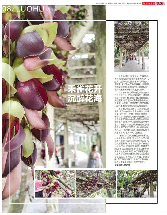 三月的深圳,春意正浓,花事不断。作为深圳禾雀花观赏的主要景观之一,近日,位于东湖公园的禾雀花即将步入盛花期,紫红色的花朵在藤蔓、人行廊架间隙陆续绽放,形成大片花海美景,吸引不少和摄影爱好者到此散步、拍