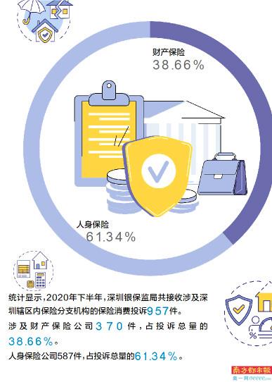 南都讯 记者卢亮 保险是“3·15”投诉的“重灾区”。日前,深圳银保监局通报2020年下半年深圳辖内保险消费的投诉情况,披露一些大数据和具体问题。统计显示,2020年下半年,深圳银保监局共接收涉及深圳辖区内保险分支机构的保险消费投诉957件。其中涉及财产保险公司370件,占投诉总量的38.66%;人身保险公司587件,占投诉总量的61.34%。