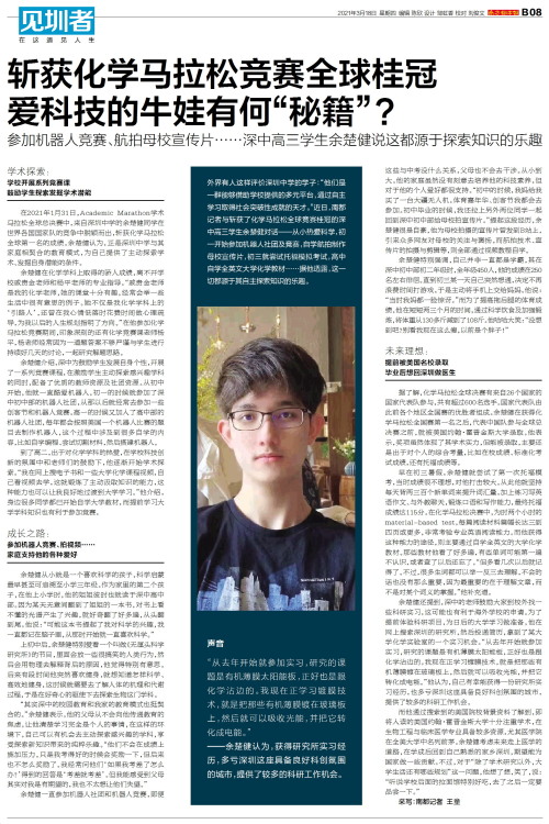 外界有人这样评价深圳中学的学子:“他们是一群能够借助学校提供的多元平台,通过自主学习取得社会突破性成就的天才。”近日,南都记者与斩获了化学马拉松全球竞赛桂冠的深中高三学生余楚健对话——从小热爱科学,初
