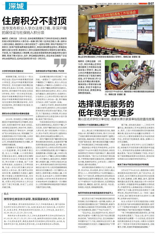 南都讯 记者伍曼娜 3月16日,深圳市南山区学校课后服务工作现场会在海滨实验小学举行,南山区三所已开展课后服务的试点学校分享了实施方案和经验。对于学校自3月1日起试点开展的课后服务,海滨实验小学受访家