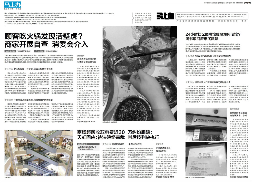 被点名单位天虹商场股份有限公司 天虹商场(坂田店)此前,深圳市龙岗区天虹商场(坂田店)的一家湘菜馆店主向南都记者报料称被超额收取电费近30万元。近日,该店主文先生再次向南都记者反映称,经过一番沟通与协