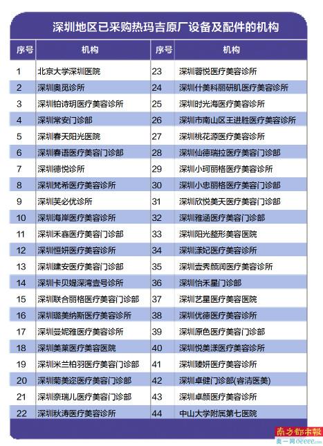 而在热玛吉的官方微信公众号“Thermage Beauty”,南都记者查询到,目前全国有393家博士伦认证的热玛吉治疗服务机构,其中深圳仅44家,深圳地区获得热玛吉官方认证的专业人士有84位。