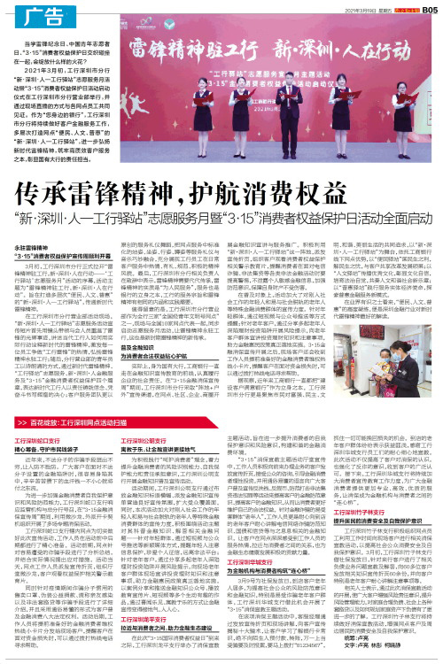 当学雷锋纪念日、中国青年志愿者日、“3·15”消费者权益保护日交织碰撞在一起,会绽放什么样的火花?2021年3月初,工行深圳市分行“新·深圳·人—工行驿站”志愿服务月活动暨“3·15”消费者权益保护日