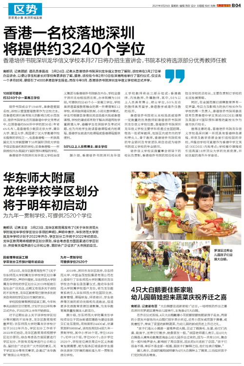 南都讯 记者王童 3月23日,龙华区教育局发布了《关于华东师范大学附属龙华学校学区划分事项的声明》。声明中表示,华东师范大学附属龙华学校计划于2022年开办,学区划分工作将于2022年初启动。龙华区教