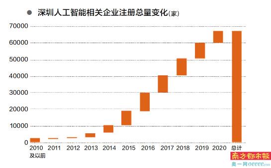 以人工智能为例,近年来深圳的人工智能产业发展迅猛,吸引了大批投资者青睐。天眼查数据显示,深圳人工智能相关企业数量从2011年的2000家上涨至2020年的6.7万余家,年均增长超6000家,涌现出了一批行业顶尖企业。