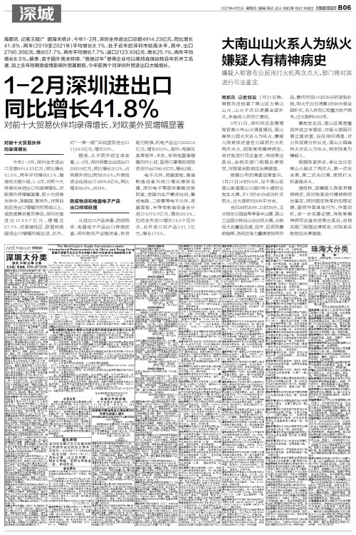 南都讯 记者王睦广 据海关统计,今年1-2月,深圳全市进出口总额4914.23亿元,同比增长41.8%,两年(2019至2021年)平均增长8.1%,处于近年的深圳市较高水平。其中,出口2790.30