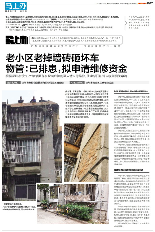 被点名单位深圳市新银物业管理有限公司灵芝管理处介入处理单位深圳市宝安区住房和建设局南都讯 记者谢萌 近日,深圳市宝安区灵芝园新村居民向南都反映称,今年以来,小区发生过多次外墙墙砖掉落的情况,居民也曾多