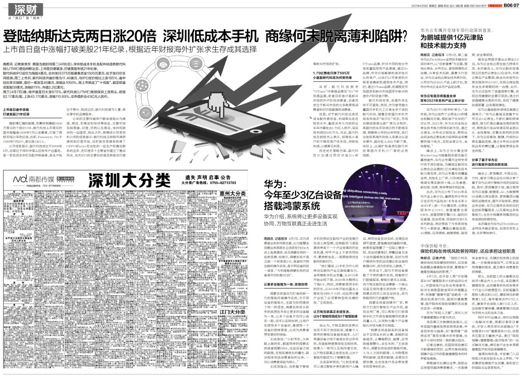 南都讯 记者黄良东 美国当地时间周二(4月6日),深圳低成本手机及配件制造商联代科技(UTME)登陆纳斯达克,上市首日便暴涨,打破美股市场21年纪录。联代科技IPO定价为每股4美元,总共发行375万股
