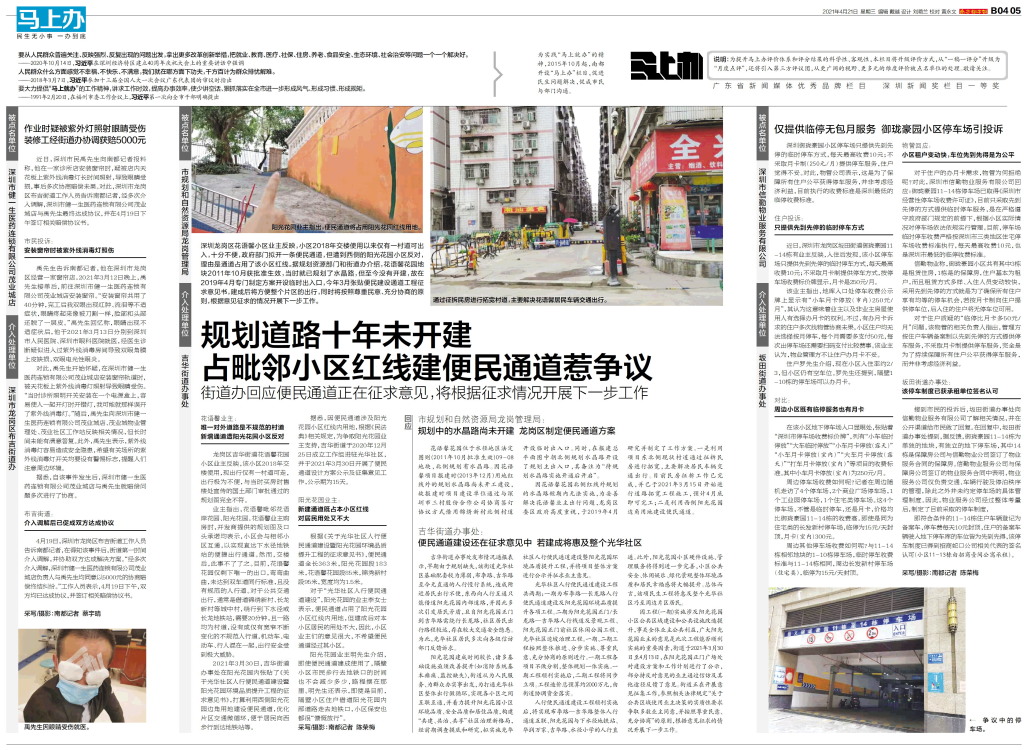 被点名单位市规划和自然资源局龙岗管理局介入处理单位吉华街道办事处深圳龙岗区花语馨小区业主反映,小区2018年交楼使用以来仅有一村道可出入,十分不便,政府部门拟开一条便民通道,但遭到西侧的阳光花园小区反