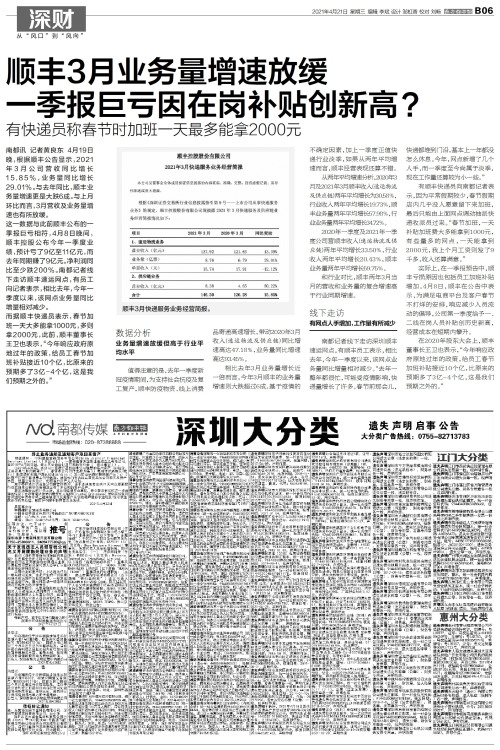 顺丰3月业务量增速放缓 一季报巨亏因在岗补贴创新高?