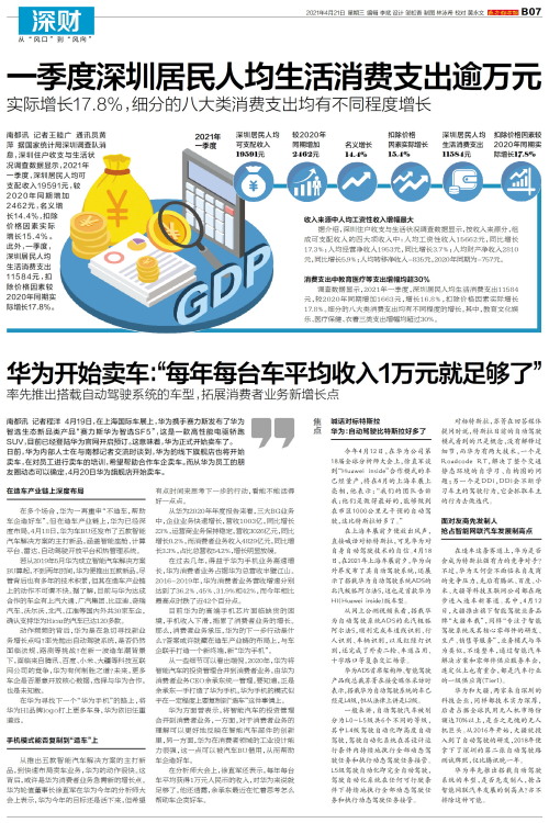南都讯 记者王睦广 通讯员黄萍 据国家统计局深圳调查队消息,深圳住户收支与生活状况调查数据显示,2021年一季度,深圳居民人均可支配收入19591元,较2020年同期增加2462元,名义增长14.4%