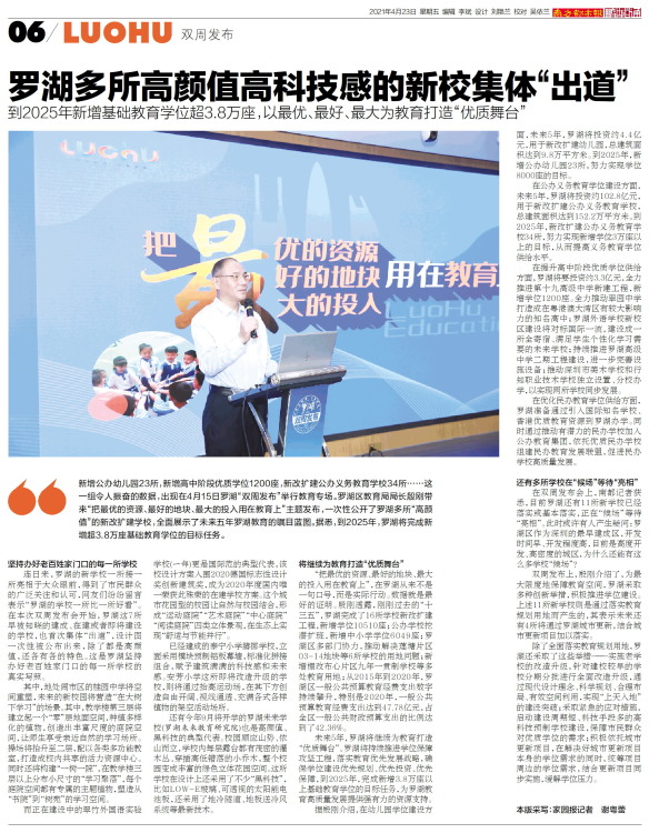 新增公办幼儿园23所,新增高中阶段优质学位1200座,新改扩建公办义务教育学校34所……这一组令人振奋的数据,出现在4月15日罗湖“双周发布”举行教育专场。罗湖区教育局局长殷刚带来“把最优的资源、最好