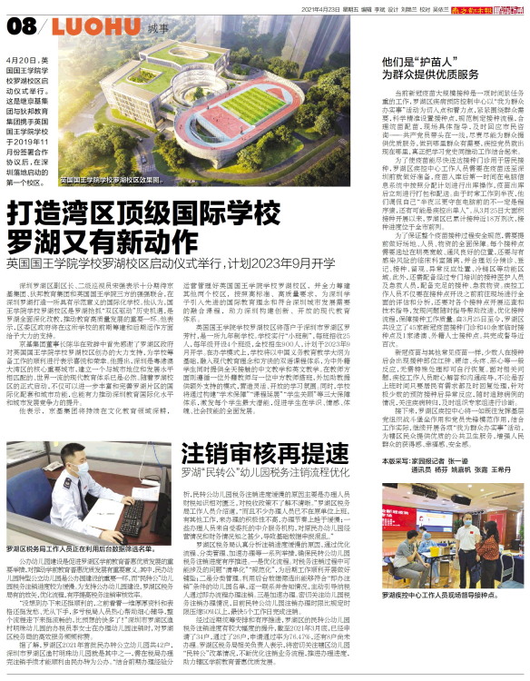 4月20日,英国国王学院学校罗湖校区启动仪式举行。这是继京基集团与狄邦教育集团携手英国国王学院学校于2019年11月份签署合作协议后,在深圳落地启动的第一个校区。深圳罗湖区副区长、二级巡视员宋强表示十