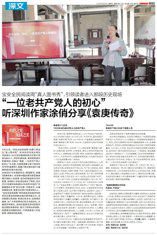 4月22日,“宝安全民阅读周”的第三场活动“真人图书秀”,在深圳市宝安区绮云书室举行。此次活动邀请到独立纪录片导演与制片人、深圳作家涂俏,来到现场进行专题讲座。涂俏以“袁庚,一位老共产党人的初心”