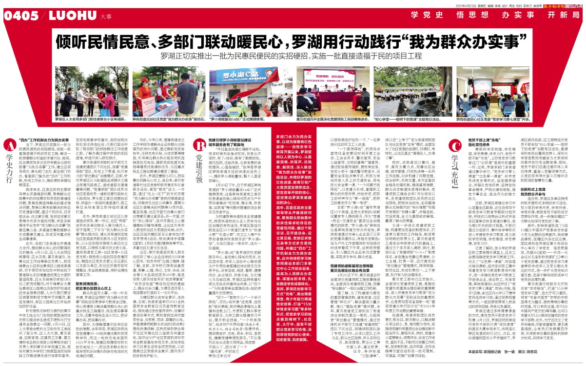 学党史 悟思想 办实事 开新局多部门合力为民办实事、以诗为媒奏响红色旋律……自党史学习教育开展以来,罗湖坚持以人民为中心,认真察民情、听民声、访民意、解民忧,深入推进“我为群众办实事”实践活动,并