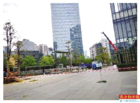4月25日,记者再次走访讯美科技广场,园区内树木已经完成移种,部分树木有支杆支撑,周边还拉有警戒线。