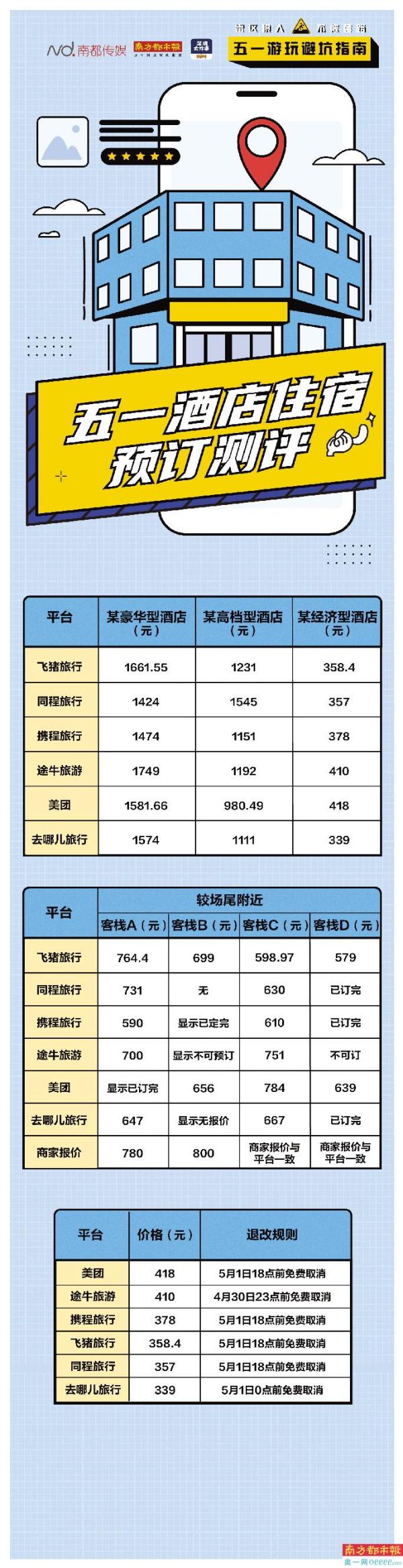 试客团队以消费者体验的方式,在同一时间段,选择5月1日入住、5月2日退房的订房时间,随机选择多个酒店或客栈的房源,分别在各APP内对比同一商户的同一房源信息,从价格、房源显示和退改服务等方面进行平行测评。