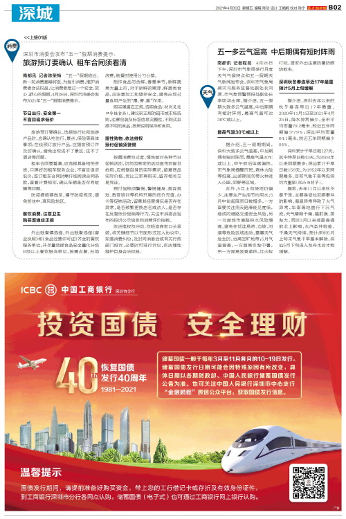 消费南都讯 记者陈荣梅 “五一”假期临近,新一轮消费高峰将至。为指引消费,维护消费者合法权益,让消费者度过一个安全、放心、舒心的假期,4月26日,深圳市消委会发布2021年“五一”假期消费提示。节