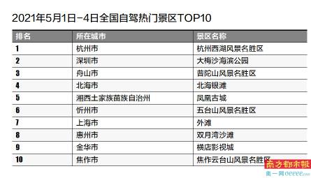 从全国各景区自驾热度来看,杭州西湖风景名胜区自驾热度最高,其次是深圳大梅沙海滨公园。另外舟山普陀山风景名胜区、北海银滩、凤凰古城、五台山风景名胜区、外滩等也上榜“五一”十大自驾热门景区。