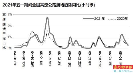 高德数据显示,全国高速5月1日交通压力最大,10时至11时出城拥堵达高峰,而5月2日10时至11时、5月3日16时至18时、5月4日16时至18时高速拥堵程度较高,其中,北京、江苏、上海、广东、安徽、浙江、重庆等高速拥堵里程占比较高。