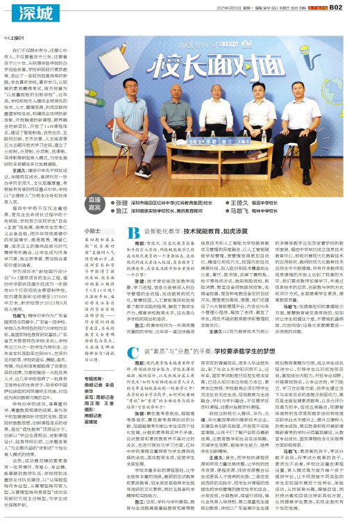 直播嘉宾张健 深圳市福田区红岭中学(红岭教育集团)校长鲁江 深圳明德实验学校校长、腾讯教育顾问王德久 福田中学校长马敢飞 梅林中学校长 “分数”和“素质”如何兼顾?这个备受家长关注的老话题,有没有新