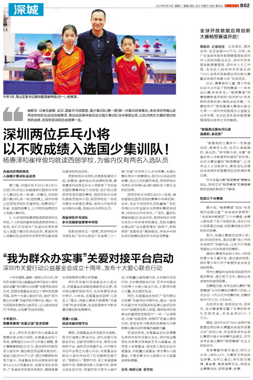 南都讯 记者伍曼娜 近日,国家乒乓球国青、国少集训队(第一期)第一次集训结束集训,来自深圳市南山区西丽学校的女运动员杨惠泽、男运动员崔梓俊在这次国少集训队当中表现出色,以队内两次大循环绝对优异的成