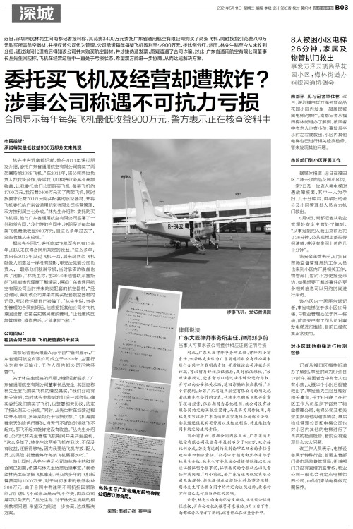 近日,深圳市民林先生向南都记者报料称,其花费3400万元委托广东省通用航空有限公司购买了两架飞机,同时按指引花费700万元购买所需航空器材,并授权该公司代为管理,公司承诺每年每架飞机盈利至少900