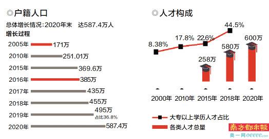 2016年8月,深圳印发《关于进一步加强和完善人口服务管理的若干意见》、《户籍迁入若干规定》等文件,提出将纯学历型人才落户门槛放宽至大专及以上,对人才入户量不设指标数量上限。这也被视作深圳加入城市“人才争夺战”的一个标志。此后,深圳户籍人口迅猛增长,至2020年末,全市在册户籍人口达到587.4万,较2015年增长217.8万,增长58.9%。