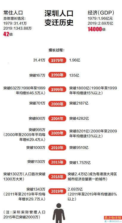 深圳1997.47平方公里的土地容纳着超过2000万人的奋斗,长达40多年的人口大迁移中,成功完成人口红利、人才红利到经济快速发展的转化,实现改革开放的初衷和使命。深圳常住人口数量从1979年的31.41万增加到2019年的1343.88万(2020数据尚未公布),40年间增长约42倍。而深圳的GDP从1979年的1.96亿元,到2019年的2.69万亿元,GDP涨了近1.4万倍,到2020年的GDP超过2.76万亿元。40多年漫长、巨量的人口迁移,与城市发展不断交织,互相作用。