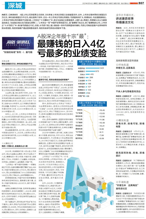南都讯 记者黄良东 A股上市公司财报季正式收官,300多家上市深企财报已全部披露完毕。去年,上市深企整体营收总额超过5万亿元,净利润总额超过5千亿元。相比前两个财年,过去一年上市深企亏损比例增加,亏