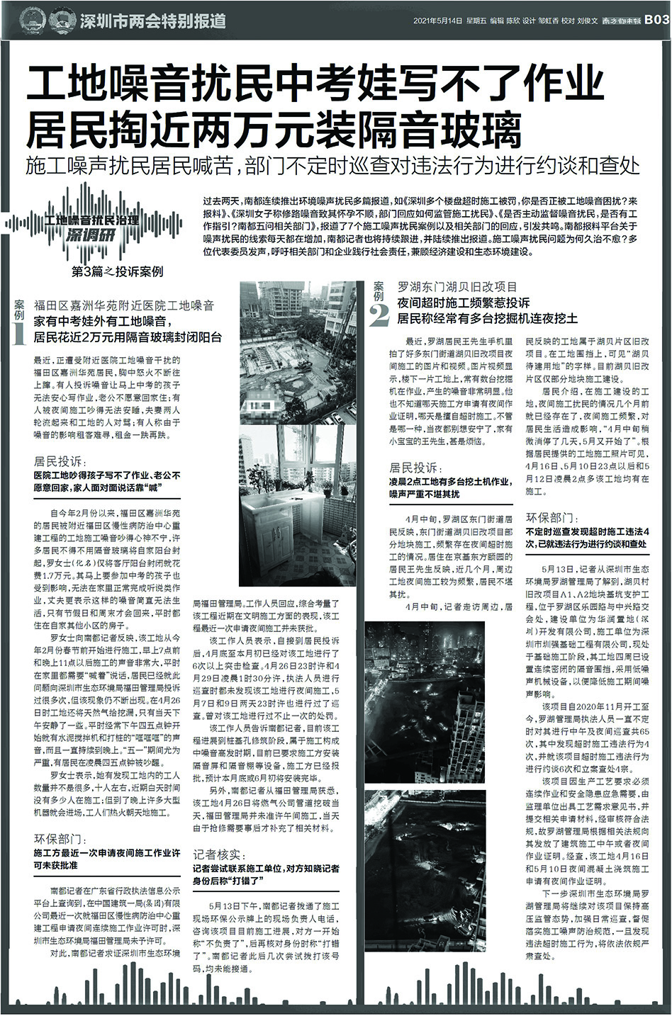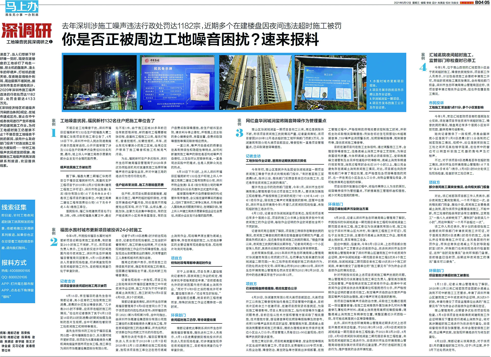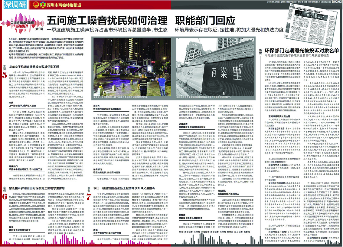 市生态环境局福田管理局方面表示,今年1月以来,福田环保部门接到了2300余宗工地噪声扰民信访投诉,接下来将加大噪声监管和执法力度,联合相关职能部门和辖区街道办,共同加强对辖区范围内建筑工地的监管,并把噪声污染防治纳入重点工作,着力解决建筑工地噪声扰民问题。