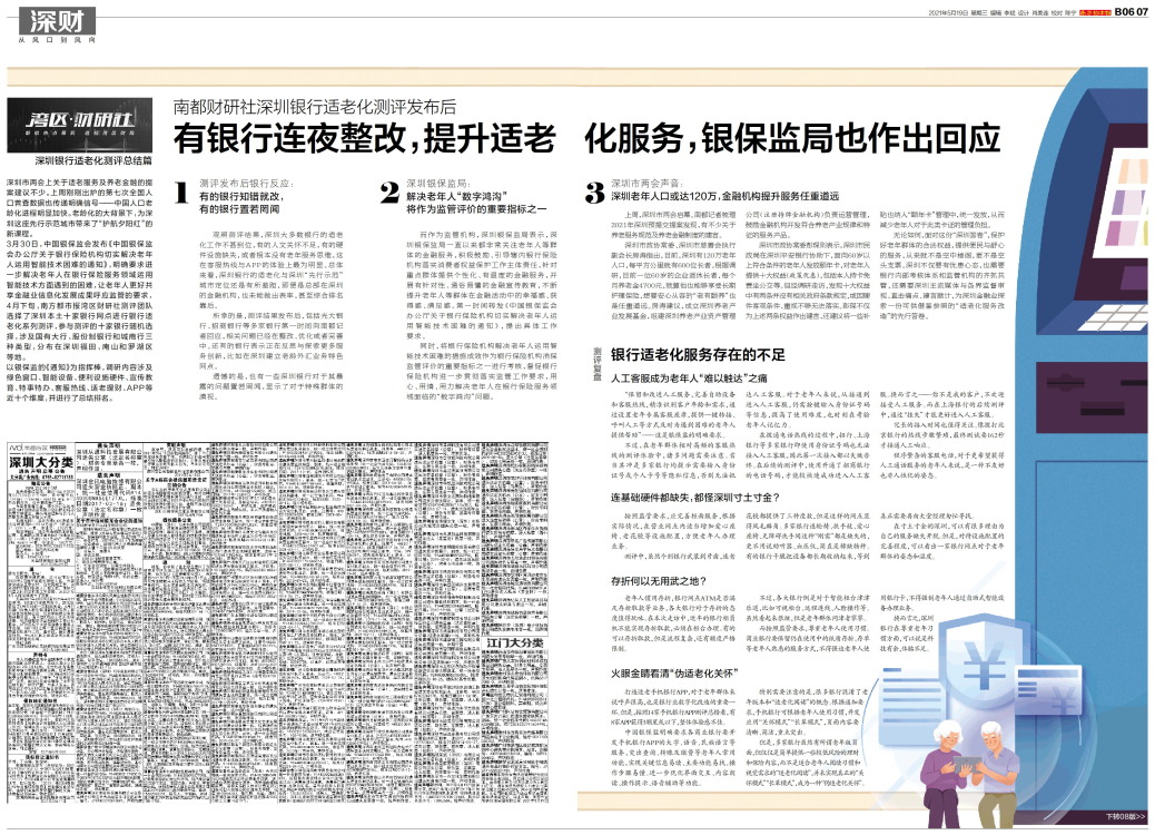 深圳银行适老化测评总结篇 深圳市两会上关于适老服务及养老金融的提案建议不少。上周刚刚出炉的第七次全国人口普查数据也传递明确信号——中国人口老龄化进程明显加快。老龄化的大背景下,为深圳这座先行示范