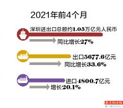 南都讯 记者王睦广 据深圳海关统计,2021年前4个月,深圳进出口总额约1.05万亿元人民币,同比增长27%。其中,出口5677.6亿元,同比增长33.6%;进口4800.7亿元,增长20.1%。如与2019年前4个月相比,今年前4个月进、出口均实现两位数增长。