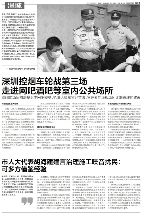 南都讯 记者徐全盛 就噪音治理方面,近日深圳市人大代表、跨越速运集团有限公司董事长胡海建介绍,在日常交流过程中,也收到过员工反映公司宿舍附近翠岗西路经常晚上施工,施工机器噪音几分钟就让人烦躁不堪,影响